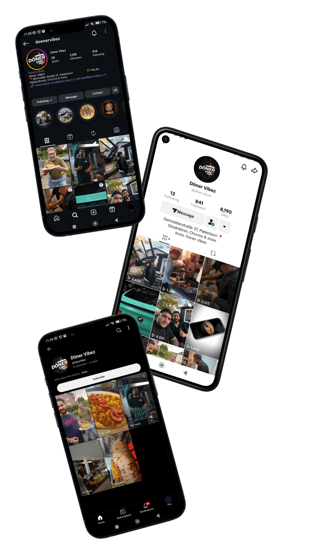 Bleib mit Döner Vibez immer am Puls – auf TikTok, Instagram und YouTube teilen wir Specials, neue Kreationen, Behind-the-Scenes und die echten Vibez aus Paderborn.